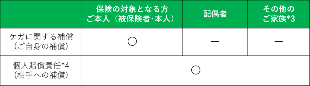 ※個人賠償責任については、お選びいただいた被保険者の型(保険の対象となる方の範囲)*1に関わらず、被保険者・本人とその配偶者*2およびその他のご親族*3まで補償します。